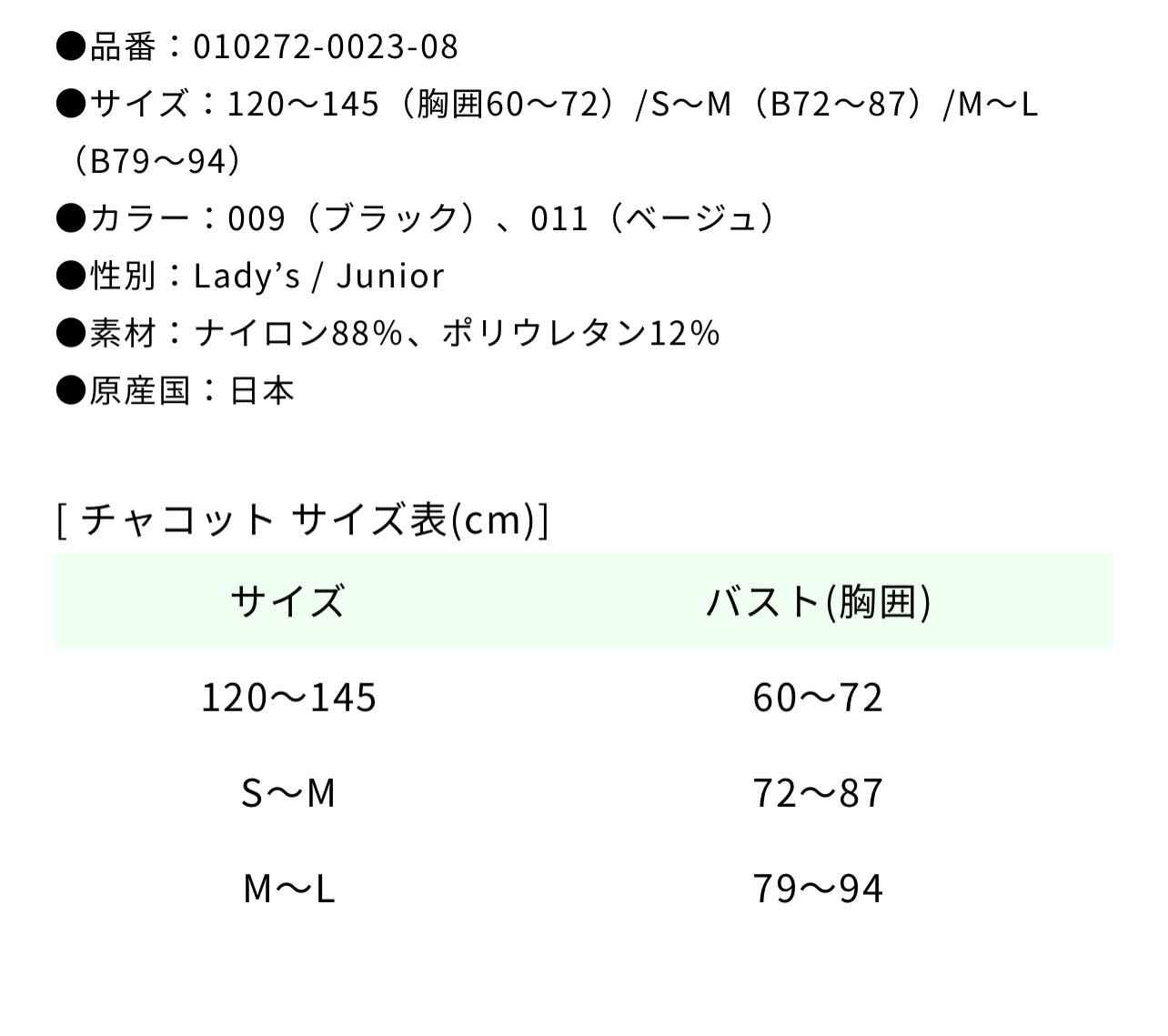 S〜M 胸囲72cm〜87cm